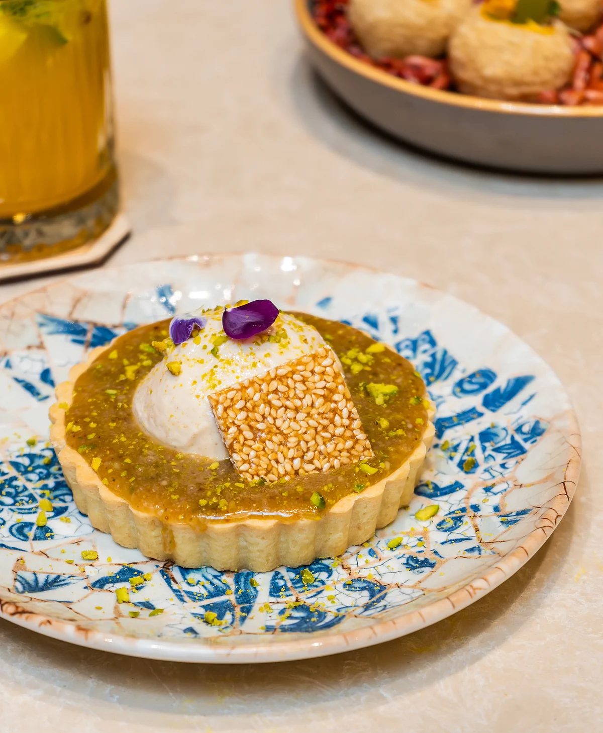 Taburkan daun kari goreng, boondi, dan bubuk jinten panggang di atasnya. Elemen-elemen ini menghadirkan lapisan tekstur yang renyah dan kedalaman berasap. Taburi sedikit dengan bubuk mint untuk mengangkat herba.